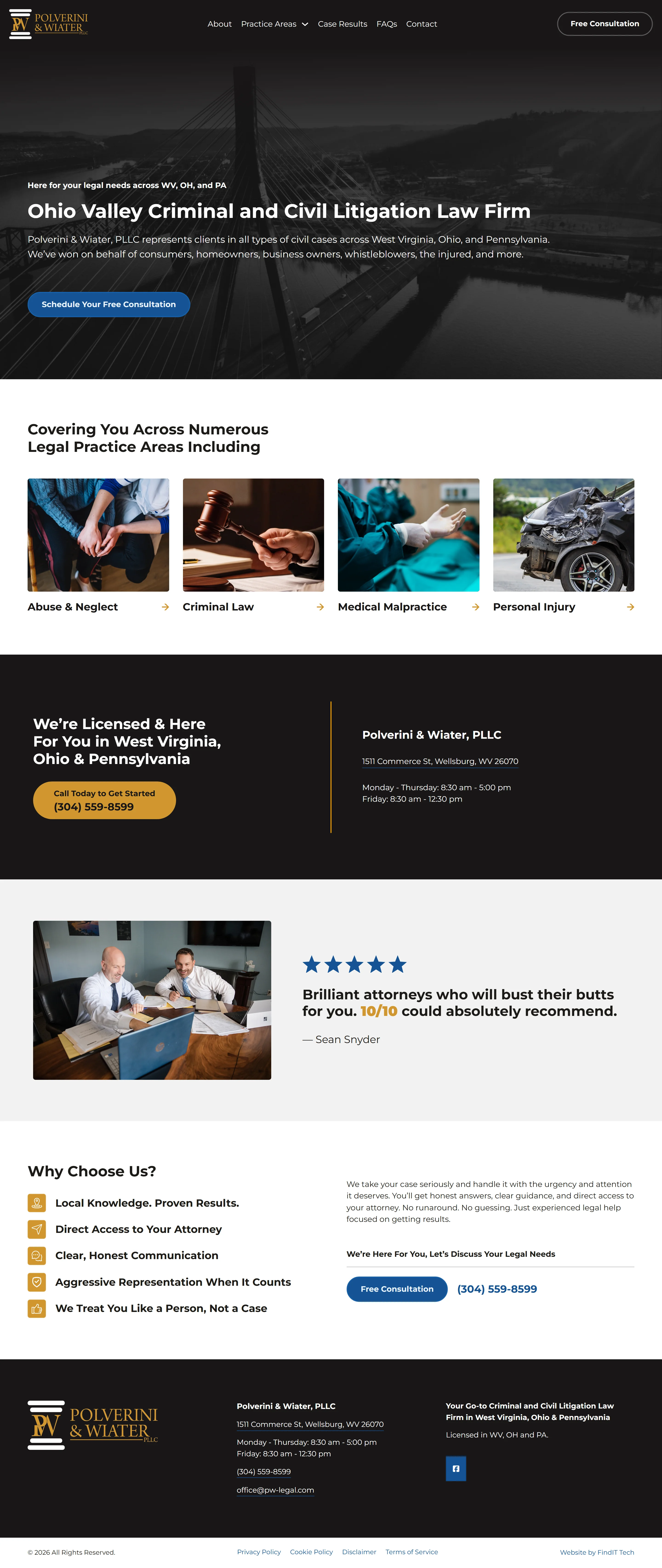 A real marketing site. WordPress with Bricks Builder on the backend, which was the stack I was working in at the time. Custom design top to bottom, no template. Dedicated pages for practice areas, case results, FAQs, and contact. A real home page that positions the firm across West Virginia, Ohio, and Pennsylvania. A clean design that signals competence instead of a shrug.